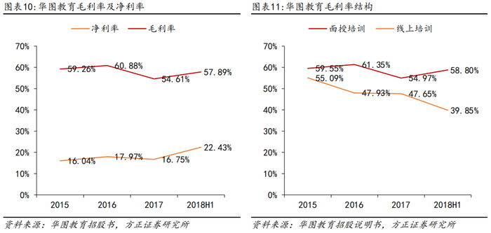 毛利率回升,净利率呈增长趋势,面授培训业务盈利能力更强。2015-2016年公司毛利率水平较高,保持在60%左右。在2017年的下跌之后,2018H1毛利率回升至57.89%。2015-2018H1净利率呈稳定增长趋势。线上培训的客单价远低于面授培训,这使面授培训业务的毛利率一直高于线上培训业务。此外,由于2018年教培市场涌入新兴机构,行业竞争日益激烈,华图教育将线上培训业务客单价减半,2018H1线上培训业务毛利率低至39.85%。