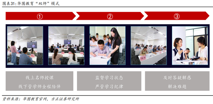 “双师“模式打破空间限制,快速实现渠道下沉。2017年12月,公司创新推出“双师”教学模式,一个班级由两位教师同时进行教学,一位是优秀的主讲老师负责网络远程教学,以直播授课为主;另一位是本地班级配备的管学老师,在远程主讲结束后负责组织本班学生讨论、教学重难点的总结、答疑、批改作业、个别辅导等。“双师”模式下,管学老师能够充分关注到每一个学员的需求。更重要的是,“双师”模式打破了地理空间的限制,通过专业双师课堂系统和专用设备,主讲老师可以同时与不同校区、不同地区的学生实时互动交流,学生即使身处教育资源相对匮乏的偏远地区,也可以享受到一流教学质量。“双师”创新模式帮助公司充分发挥了名师资源优势,以已有的教学团队快速实现渠道下沉。