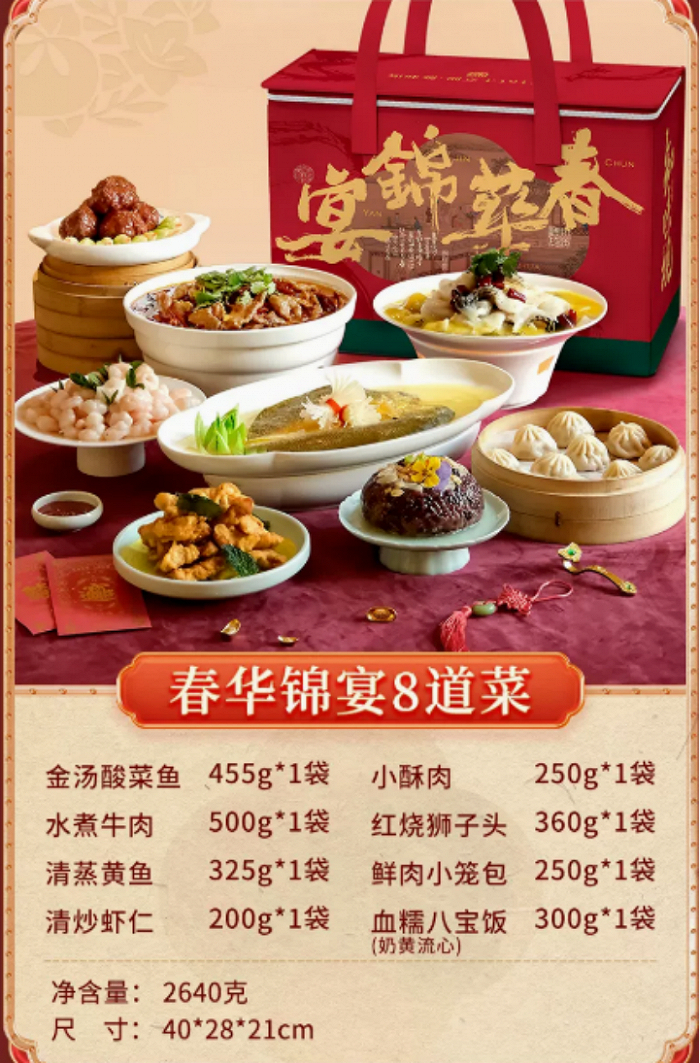 其中,名为知味观年夜饭的预制菜月销已达到500+,其春华锦席商品(2640g)包含金汤酸菜鱼、清炒虾仁、小酥肉、红烧狮子头等共计8道的各地传统名菜,售价仅为305元。