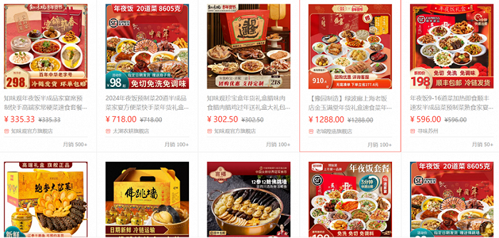 春节前夕,淘宝、拼多多等电商平台内早就上线了年夜饭预制菜商品,且销量均可观。据伯虎财经观察,淘宝内有关年夜饭预制菜、年夜饭半成品的销量多的可达到月销500+,低的也有50+;这些年夜饭预制菜的价格也不贵,传统8道年夜饭菜席也就300元左右,贵的1000元,包含佛跳墙这类名菜。