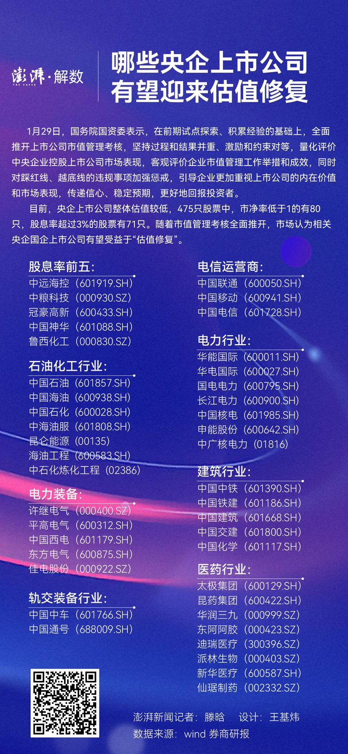 从券商研报看,市场预期市值管理全面推开将进一步促进央企经营提质、降本增效、并购重组、提升股东回报等,从而提升央企上市公司估值。同时,电信、石油、电力、建筑、医药、装备等板块的央企上市公司被看好。