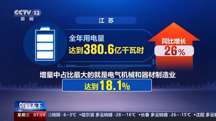 在江苏,全年用电量达到380.6亿千瓦时,同比增长26%,增量中占比最大的就是电气机械和器材制造业,达到18.1%。
