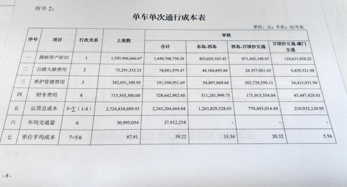 定价成本主要包括固定资产折旧、公路大修费用、养护管理费用、财务费用、大桥通车后收费期限内的总交通量等。杨晓程介绍道,其中路桥固定资产折旧14.5亿元,公路大修费用7490.2万元,养护管理费1.92亿元,财务费用5.29亿元。