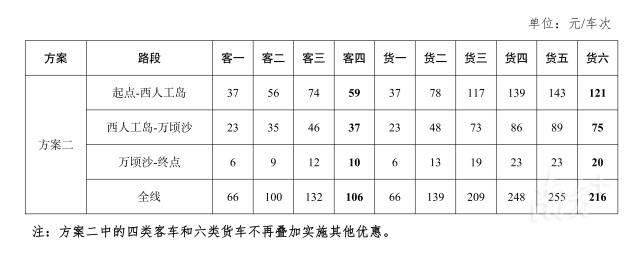相比之下,方案二对四类客车和六类及以上货车给予费用减免,两类车享有20%的通行费优惠,六类货车收费比方案一减少了54元/车次,更多考虑的是降低物流成本。