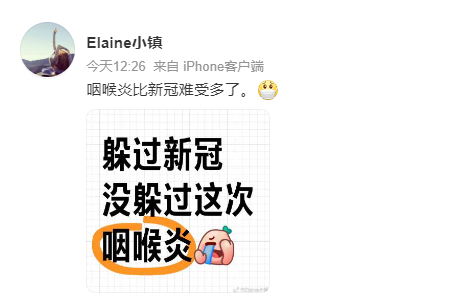 与王媛情况类似的网友在社交媒体上不在少数,甚至有网友表示,“咽喉炎比新冠难受多了”“躲过新冠,没躲过这次咽喉炎”。还有网友称,“下午嗓子干,晚上就直接‘吞刀片’了,浑身酸痛。”“这是专门攻击嗓子的病毒吗?扁桃体都化脓了,咽口水都疼,这都9天了。”
