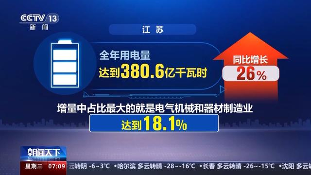 在江苏,全年用电量达到380.6亿千瓦时,同比增长26%,增量中占比最大的就是电气机械和器材制造业,达到18.1%。