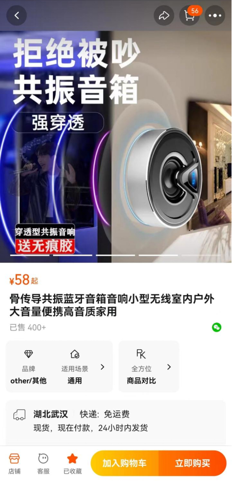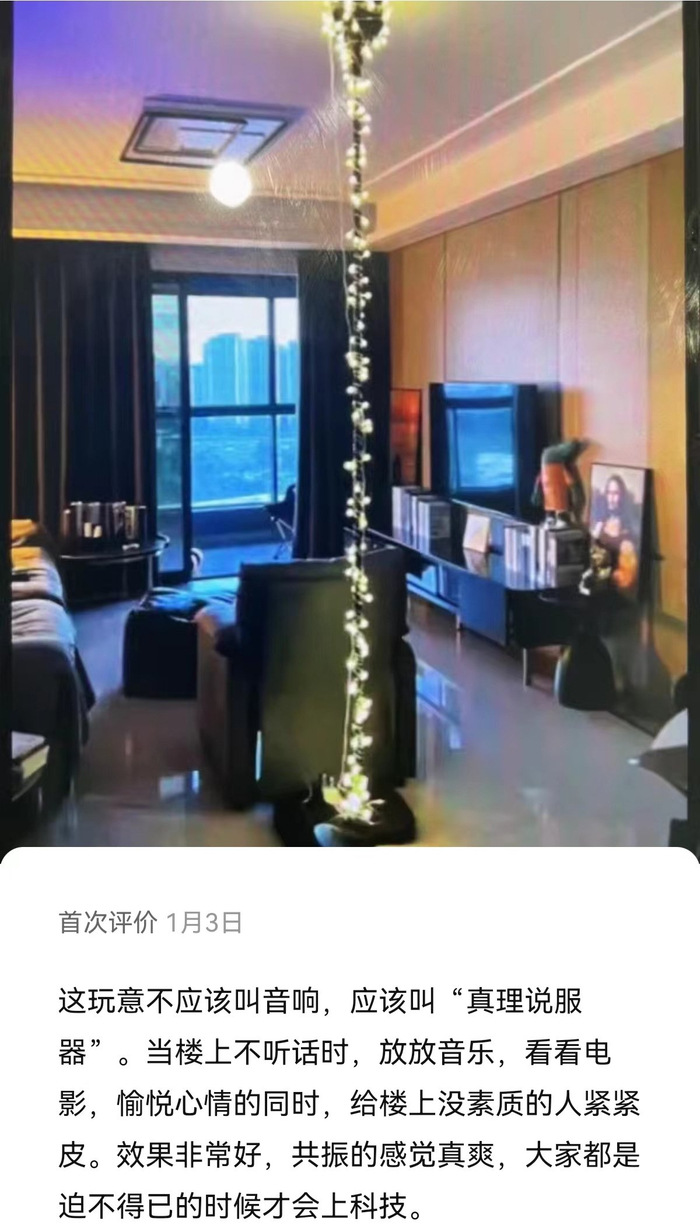 记者还发现,震楼器如今已迭代更新,原用于工业的震楼器不再“吃香”,如今广受欢迎的是一种“骨传导共振蓝牙音箱”,以其强穿透力达到共振效果,这一产品的销量明显高于传统震楼器。这些商家规避了“震楼”“震动”“噪声”等关键字眼,仅以音箱产品售卖,有的甚至打上了“邻里和谐神器”的标签。但当消费者购买这样的音箱,卖家会赠送降低自家噪声的隔音海绵、固定用的支撑杆和多款噪声音频。通过“买家秀”,记者发现,与传统震楼器不同的是,这种音箱会减少对自家的影响,但其噪声和振动除了干扰楼上,仍会波及楼上的楼上以及左邻右舍。