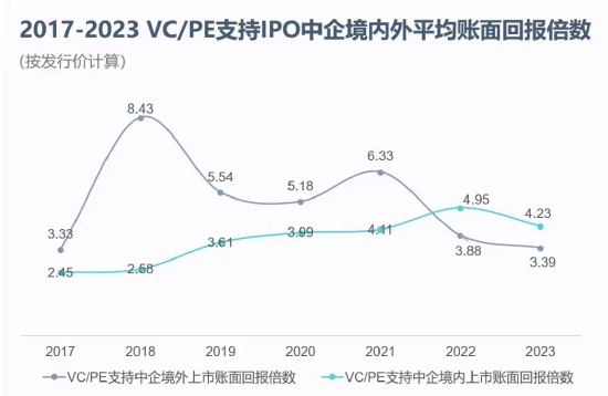 清科研究数据显示,2023年中企境内外上市399家,在中企IPO节奏放缓的背景下,VC/PE机构不仅收获IPO数量减少,而且通过IPO获益的难度进一步加大:A股平均账面回报水平为4.23倍,境外市场的平均账面回报水平为3.39倍,与2022年相比,项目IPO的发行回报倍数整体下移,高额回报案例大幅减少。