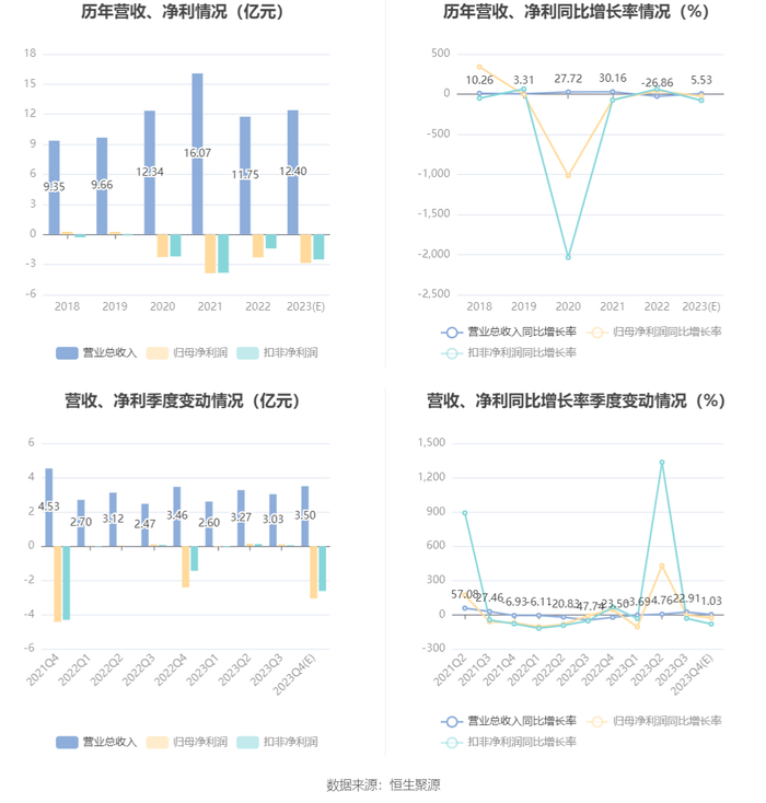 中证智能财讯 平潭发展(000592)1月30日晚间披露2023年度业绩预告,预计2023年实现营业收入11.9亿元至12.9亿元;归母净利润亏损2.3亿元至3.4亿元,上年同期亏损2.29亿元;扣非净利润亏损2亿元至3亿元,上年同期亏损1.4亿元;基本每股收益-0.1191元/股至-0.176元/股。以1月30日收盘价计算,平潭发展目前市盈率(TTM)约为-14.83倍至-21.92倍,市净率(LF)约2.11倍,市销率(TTM)约4.07倍。值得注意的是,公司业绩连续四年亏损。