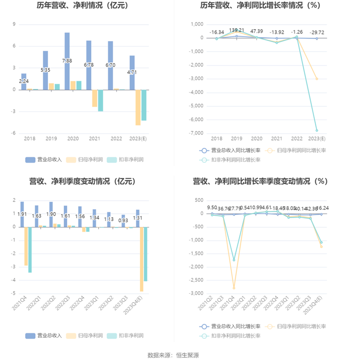 据公告,报告期内,结合行业市场变化和未来经营情况发展判断等影响,基于谨慎原则,公司对2019年收购深圳市明日实业有限责任公司所形成的商誉进行了初步评估和测算,预计2023年计提商誉减值金额约3.9亿元(最终计提的减值金额将由评估机构及审计机构进行评估和审计后确定)。报告期内,受行业周期影响导致公司云视频业务和云视频硬件收入下降,但三维云视频创新业务收入比上年同期有较大幅度增长。报告期内,公司非经常性损益对净利润的影响额预计约-6451.27万元,主要为其他非流动金融资产持有期间的公允价值变动损益。