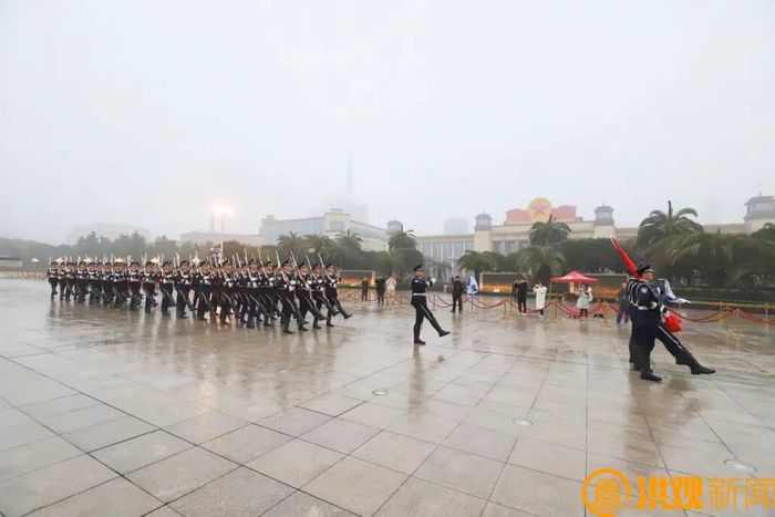 1.播放音乐《中国人民解放军进行曲》,国旗护卫队从八一南昌起义纪念塔下东侧候场区走向金水桥,国旗护卫队走过金水桥,走至八一南昌起义纪念塔前方空地时音乐停止;(时长约2分30秒)