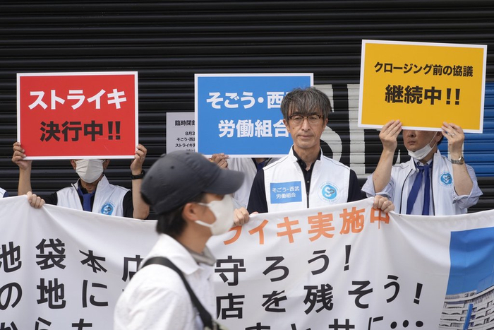 当地时间2023年8月31日,日本东京,老牌百货商场崇光·西武停业一天,约300名商场工会员工举行抗议活动,反对向峰堡投资集团出售崇光·西武。