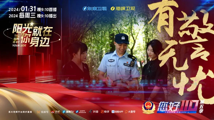 1月31日,《您好,110》第五季周三晚9:10东南卫视电视频道播出,视频号、微博、B站、海博TV、LIVE东南、抖音、快手、百度、大鱼号等各大网络平台同步直播。