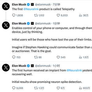马斯克在社交平台X上宣布,首位人类接受了Neuralink的植入。