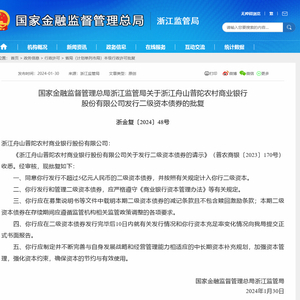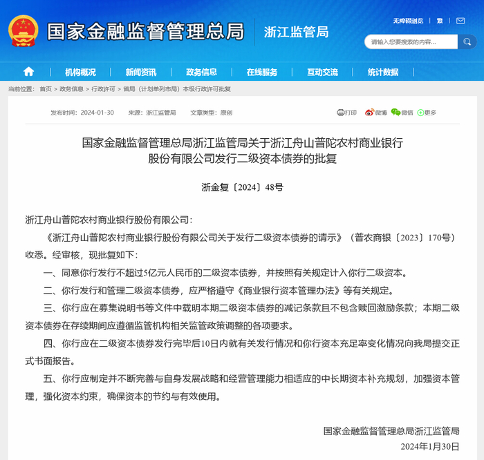 国家金融监督管理总局浙江监管局还在批复中指出,浙江舟山普陀农村商业银行行发行和管理二级资本债券,应严格遵守《商业银行资本管理办法》等有关规定。