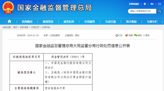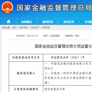 国家金融监督管理总局大同监管分局行政处罚信息公开表(同金管罚决字〔2024〕1号)