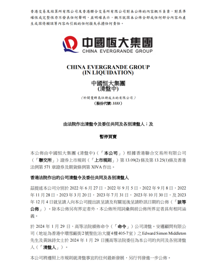 1月29日,恒大清盘案在香港高等法院再提讯。法官表示,恒大债务重组方案欠缺进展,公司资不抵债,正式颁令恒大清盘。