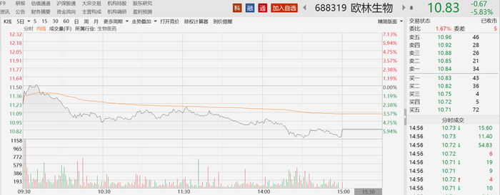 受此影响,今天A股开盘,欧林生物股价飘绿,盘中一度下跌近7个百分点。截至当天收盘,股价下跌5.83%,报10.83元/股。