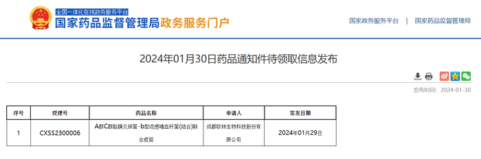 国家药监局(NMPA)官网也显示,欧林生物的“A群C群脑膜炎球菌-b型流感嗜血杆菌(结合)联合疫苗”出现在了“药品通知件待领取”栏目下,而不是出现在“药品批准信息”栏目下。