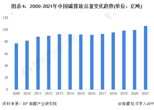 据英国石油公司(BP)的统计数据显示,2009-2019年,我国碳排放量由77.1亿吨提升至98.3亿吨,稳居世界第一。2020年由于我国疫情防控得当,各行业较快复苏,碳排放量达到99.7亿吨,同比增长1.4%。2021年,受复工复产叠加极端天气频发导致的电力需求上涨,2021年中国碳排放总量再次增加,达到105.9亿吨。