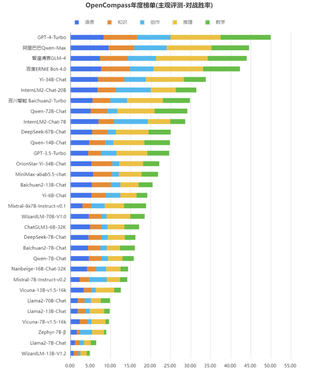 基于语言、知识、创作、数学与推理等五个维度,OpenCompass2.0构建了超500道高质量中文问题,采用基于大语言模型对战的方式评测主流模型在开放场景下的对话体验。