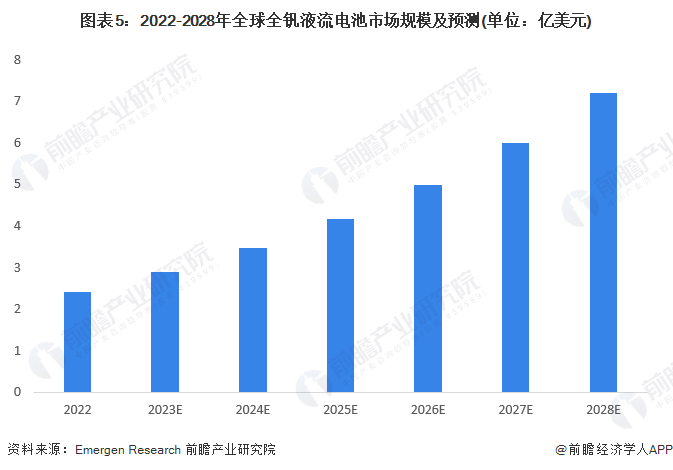 据Emergen Research分析,2022年全钒液流电池全球市场规模约为2.42亿美元,得益于全球对环保电池解决方案以及储能系统的需求推动,预计到2028年市场规模将以19.9%的年复合增长率增长,有望达到7.2亿美元。