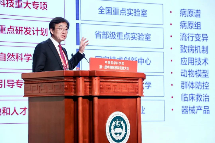 他指出,中国医学科学院作为我国医学卫生健康领域的国家队,在历次国家重大公共卫生事件中发挥了重要的科技支撑作用,为我国及世界新发病原体的发现和预警防控工作贡献了科技智慧和中国力量。希望中国医学科学院坚持围绕“构建人类命运共同体”的理念,与世界各地优秀的病原学领域科学家广泛交流合作、不懈探索,为促进病原学学科高质量发展,构建病原学发展新未来贡献力量。