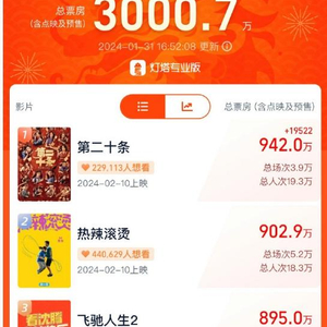 灯塔专业版实时宣发数据显示,《热辣滚烫》《飞驰人生2》《第二十条》《熊出没10》位列淘票票“想看”前四名。其中,《热辣滚烫》定档后连续20天获得灯塔“想看”冠军,强势领跑春节档。