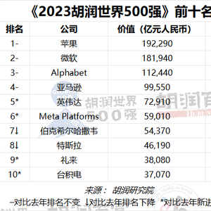 2023胡润世界500强:苹果以19万亿元价值蝉联世界上最具价值的公司