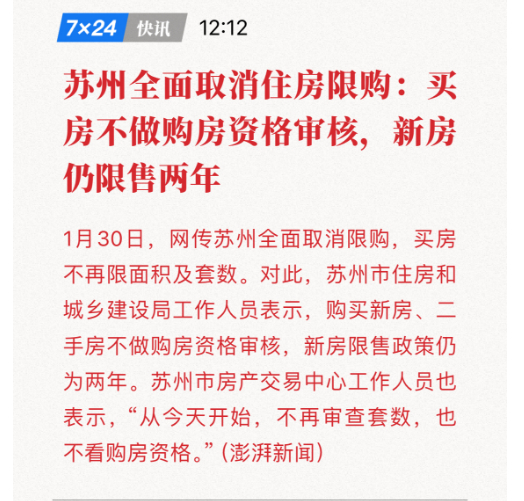 昨天苏州全面取消限购了!可惜的是,新房仍限售2年。