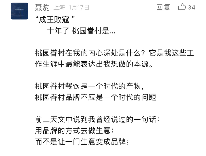 “败走广东”传闻在互联网上发酵10天之后,1月17日,桃园眷村公众号发布了一篇标题为《我们的十年》的文章,文中一句“人生总是有起有落,我们身在时代的浪潮中,很多事情确实身不由己”,或许可以算作是品牌对近期风波的回应,也从侧面印证了这家红极一时的“高端中式早餐”,正在面对前所未有的考验。