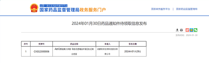 1月30日,国家药监局(NMPA)公示药品通知件待领取信息。涉及产品为国内疫苗公司欧林生物的A群C群脑膜炎球菌-b型流感嗜血杆菌(结合)联合疫苗(AC-Hib联合疫苗)。该产品未获得批文。另外,丁香园insight数据库显示,该产品“上市申请未被批准”。