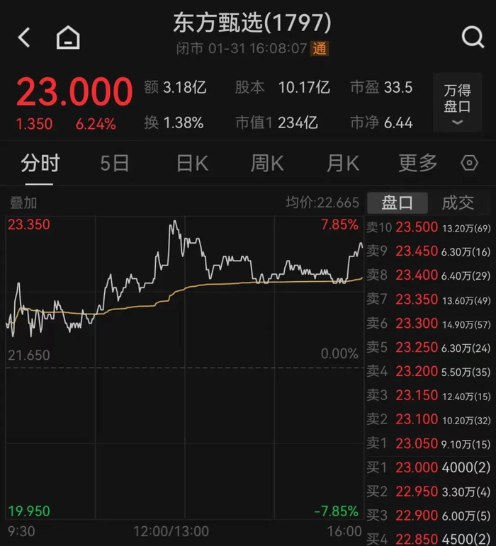 1月31日,东方甄选一度大涨7.85%,最终收于23港元/股,上涨6.24%。
