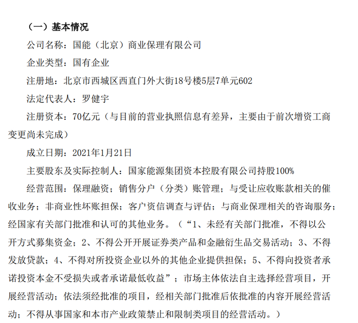国能(北京)商业保理有限公司是国家能源集团所辖资本控股有限公司全资子公司,是为落实国家能源集团产业金融发展战略,强化财务金融一体化管控而成立的专业化供应链金融单位。公司于2021年1月成立,注册资本40亿元,注册地为北京市西城区。