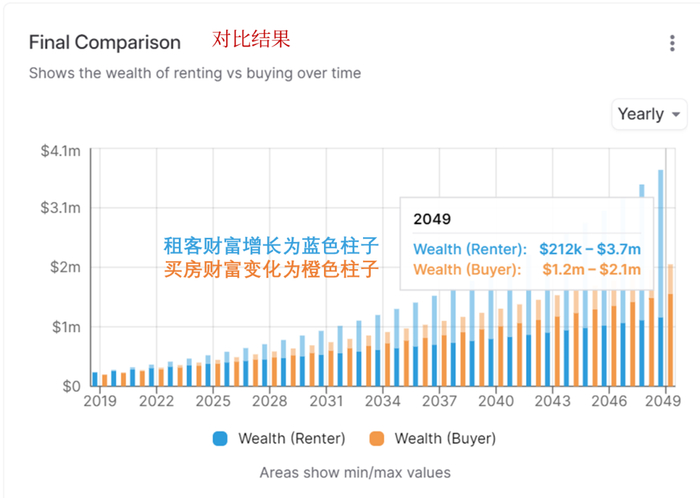 可以看到,30年后,你选择租房+投资的财富范围是「21万-370万」,你买房的身家区间是「120万-210万」。
