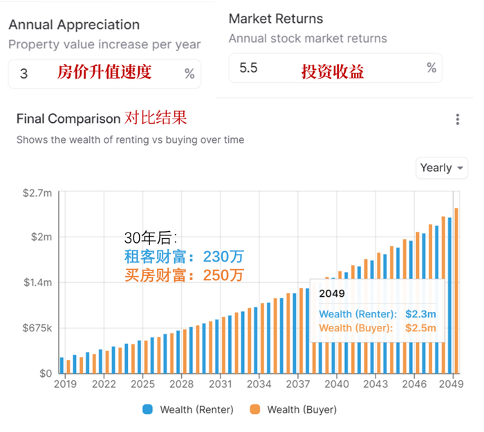 那么十年内,租房得到的财富更多;三十年后,买房稍稍占优。