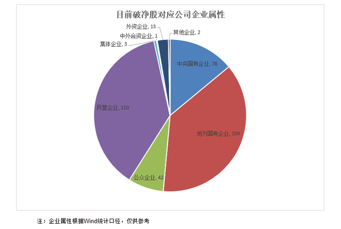 另据Wind统计口径,从企业属性来看,上述破净股公司群体中,中央国有企业、地方国有企业分别有78家和209家,合计287家,占到破净股公司总数的一半以上,带有国资色彩的上市企业是破净公司最多的群体。除了各类国有上市企业之外,民营上市企业中破净公司也较多,超过200家。公众企业、集体企业、中外合资企业、外资企业等其他企业属性的上市企业破净股公司数量相对较少。