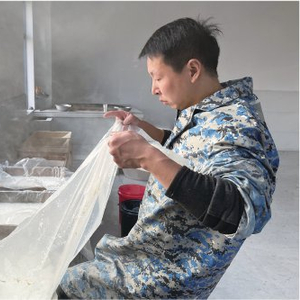 张文雨一开始在潘集区经营小作坊,一天大概能做2000斤豆子,制作单一品类的千张。由于潘集区2017年进行环保改造,考虑到自己已经拥有的市场销售渠道,张文雨放不下他的豆腐事业。正值八公山工业园区在招商引资,经确认企业达到相关食品安全标准要求后,2021年,优豆坊入驻八公山豆腐工业园区。4000斤,6000斤,8000斤,优豆坊一步一步在生产上做增量,品种也逐渐扩展到千张、素鸡、香干、油干、豆皮等多种品类。