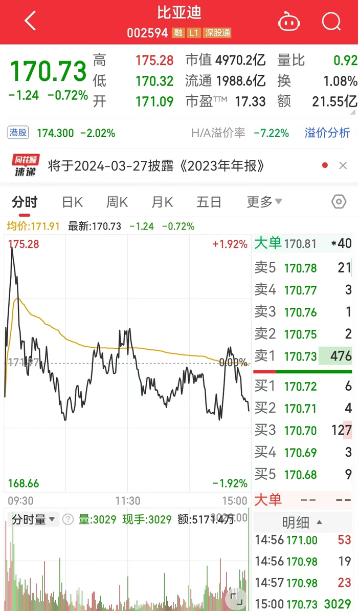截至1月31日收盘,比亚迪(002594)报170.73元,当日跌幅0.72%,市值4970.2亿元。