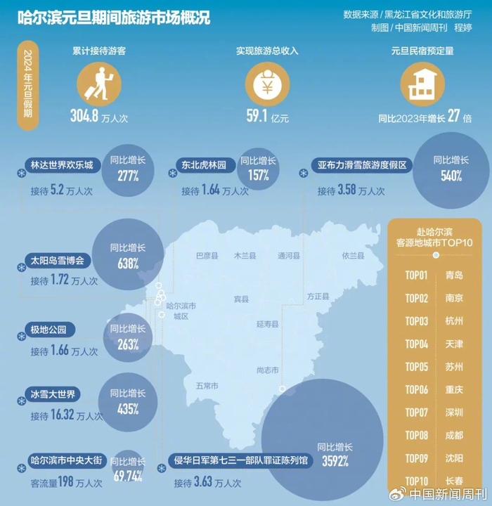 “退票”风波的妥善处理成为哈尔滨走红的开端。舆论风向翻转,网友开始为景区“伸冤”。元旦假期,哈尔滨市累计接待游客304.79万人次,实现旅游总收入59.14亿元。