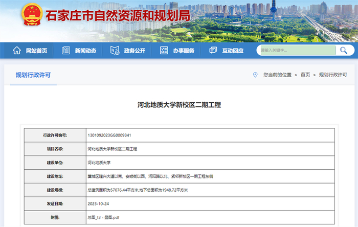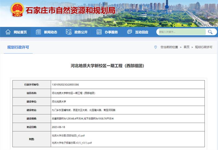 据石家庄自然资源和规划局消息,去年,河北地质大学新校区一期工程(西部组团)和河北地质大学新校区二期工程均已获得规划许可。