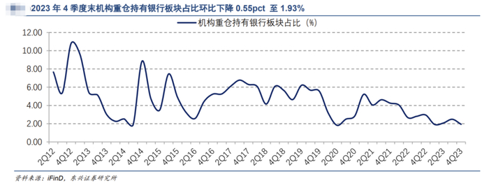 具体而言,2023年四季度末公募基金重仓持有银行板块占比环比下降至1.93%,是近十年来的低位。国有大行和农商行持仓环比略有改善,而股份制银行和城商行明显遭遇减持。在去年四季度末,包括招商银行在内的优质银行均遭遇抛售。