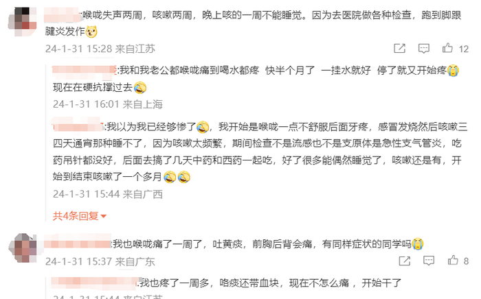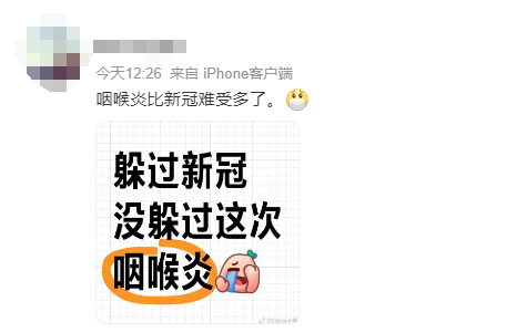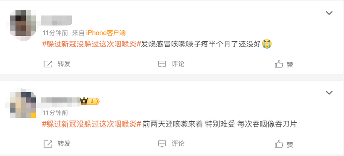 与王媛情况类似的网友在社交媒体上不在少数,有网友称,“晚上咳得一周不能睡觉”“每次吞咽像吞刀片”“这是专门攻击嗓子的病毒吗?扁桃体都化脓了,咽口水都疼,这都9天了。”