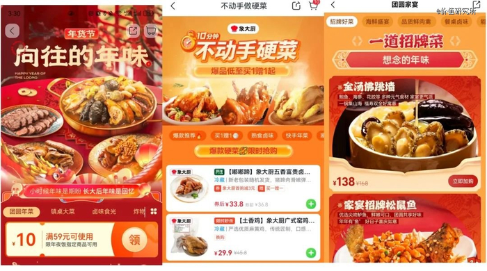值得注意的是,2023年也是消费降级席卷全国的一年。预制菜的价格定位,尤其是为春节准备的各种硬菜、盆菜,和这股潮流背道而驰。盒马、美团小象超市、朴朴超市等平台则在坚决执行折扣化改革,试图用低价巩固用户心智,不再主推走高价路线的预制菜也在情理之中。