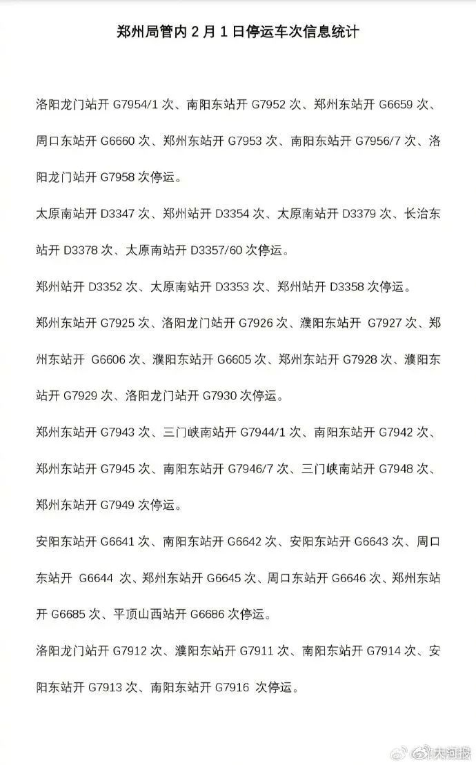 受中东部地区大范围雨雪冰冻天气影响,为确保旅客列车运行安全和旅客出行安全,2月1日郑州局管内的G7952次、G7914次、D3353次等部分列车停运。