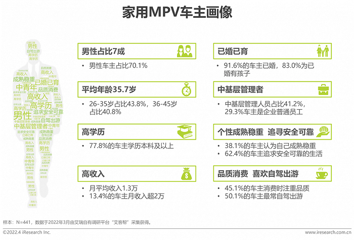 从2022年3月艾瑞咨询有关家用MPV车主画像调研来看,MPV的增量市场——家用MPV的受众是中产们“中基层管理者、月平均收入1.3万元,13.4%的车主月收入超2万”。