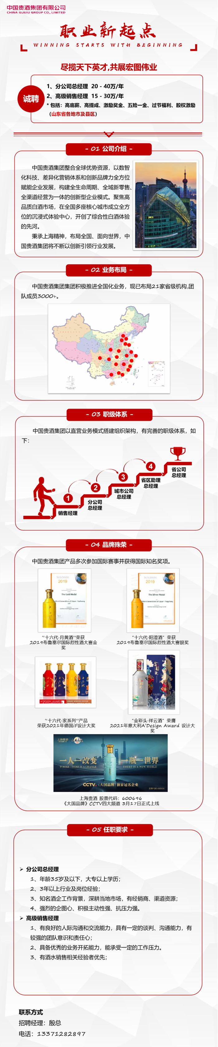 记者曾以应聘者的身份报名,招聘资料显示“ 中国贵酒集团集团积极推进全国化业务,现已布局21家省级机构,团队成员3000+”。招聘人员告诉记者,“目前山东分公司较多,临沂,青岛,济南都有,分公司负责人年薪20-40万,入职之后需要经常到上海出差。”