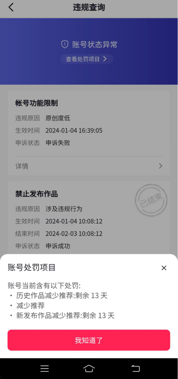 但是9月开始,某头部平台开始了强监管,要求必须千粉才能挂链接。最严格的,则是该平台从去年11月开始了严打搬运的政策。之后,赵蓉蓉收入陡降。今年1月初,赵蓉蓉又因为发布的短剧切片违规被罚而注销了账号,“我的素材也得到了授权,但是平台还是给我限流了。没量我就注销了重新注册。”