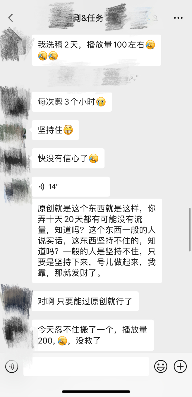 四川宜宾的赵敏在一家美甲店工作,平时做短剧切片,她去年靠着搬运赚了些钱,但最近准备放弃了,“我前几天洗稿洗了2天,每次剪3小时好不容易过了原创,播放量100左右。今天忍不住搬了一个,播放量200,别说出单了,这点流量啥用也没有,真是没救了。”