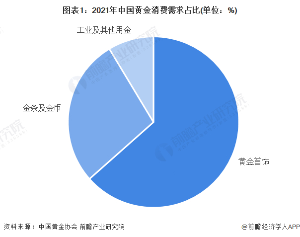 黄金是一种特殊的贵金属,具有商品和金融双重属性,但自从其被世人所发现以来,一直被用于首饰的制作,具体看2021年我国黄金下游消费领域,其中,饰品消费是我国主要黄金消费需求,2021年我国黄金首饰消费量711.3吨,同比增长45%,占我国2021年黄金消费比重的60%以上;其次分别为金条及金币和工业及其他用金。
